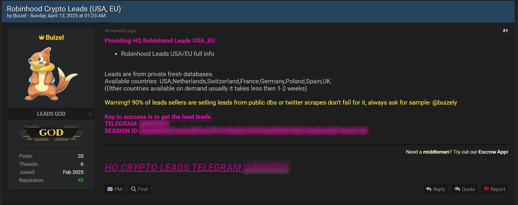 Faqatgina $10,000 evaziga sotib oluvchilar to’liq ismlar, elektron pochta manzillari, telefon raqamlari va jismoniy manzillarni o’z ichiga olgan batafsil ma’lumotlarga ega bo’lishlari mumkin. Bu ma’lumotlar taniqli platformalardan olingan bo’lib, millionlab foydalanuvchilarni shaxsiy ma’lumotlar o’g’irligi va boshqa kiber jinoyatlarga duchor qilishi mumkin.