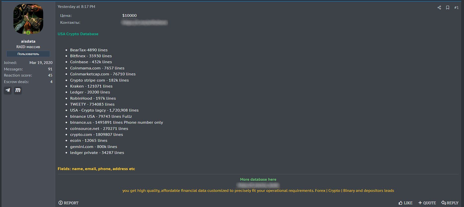 “Bir tahdid aktori ko‘plab birjalar va platformalardan olingan katta hajmdagi AQShda joylashgan kriptovalyuta foydalanuvchilari ma’lumotlar bazasini sotmoqda”, deb yozilgan postda.
