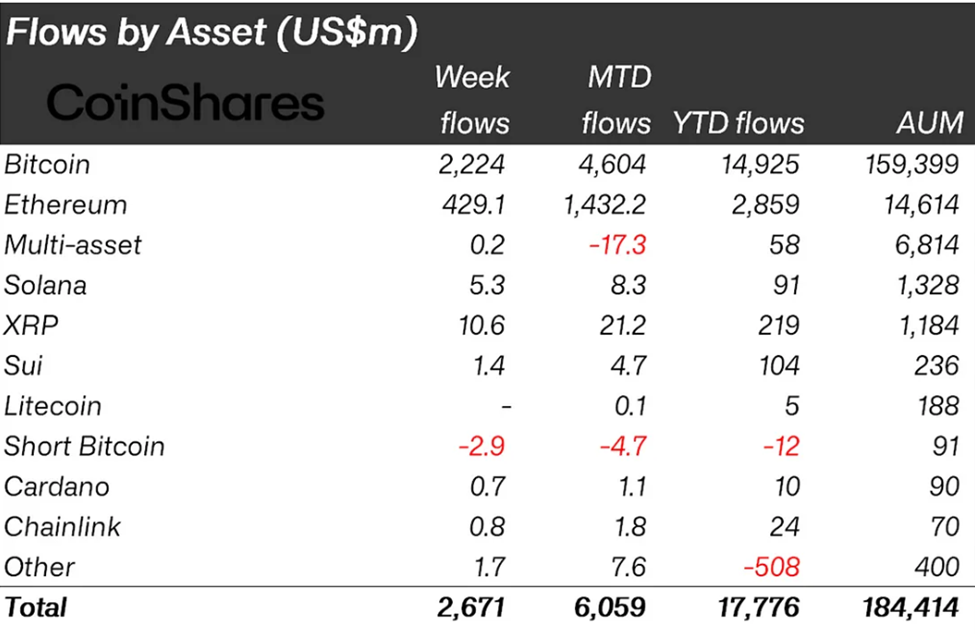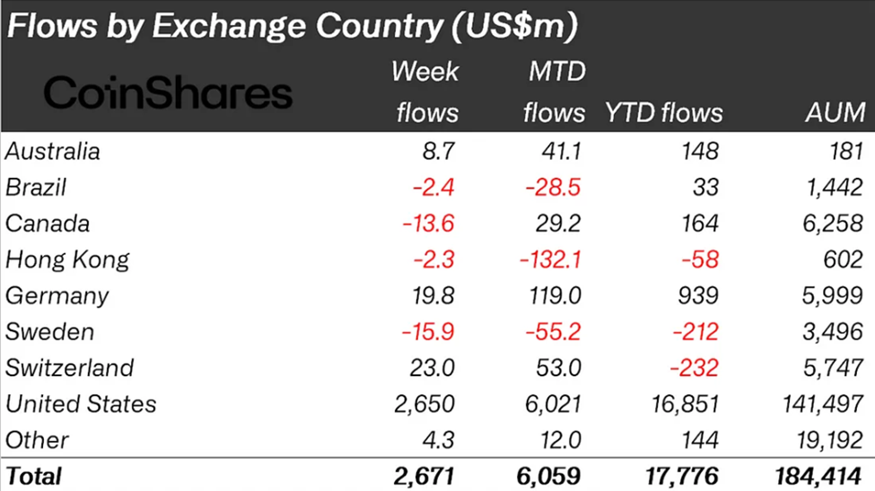 «CoinShares» tadqiqotiga ko’ra, o’tgan haftadagi oqimlarning asosiy qismi AQShda to’plangan bo’lib, 2,65 milliard dollarni tashkil etdi.