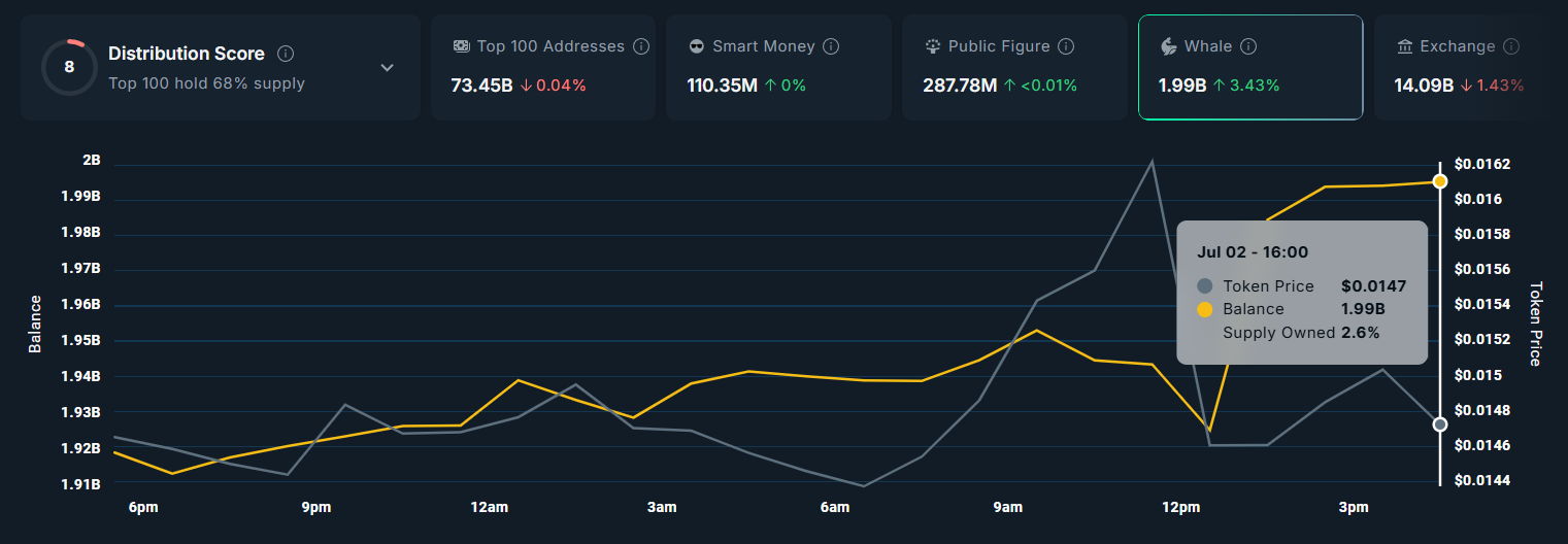 PENGU yaqinda katta investorlar, ya’ni kitlar tomonidan katta qiziqish uyg’otdi. So’nggi 24 soat ichida 60 milliondan ortiq token sotib olindi. Bu katta investorlar orasida memkoinning qiziqishini ko’rsatadi va bu likvidlikni oshirishi mumkin.