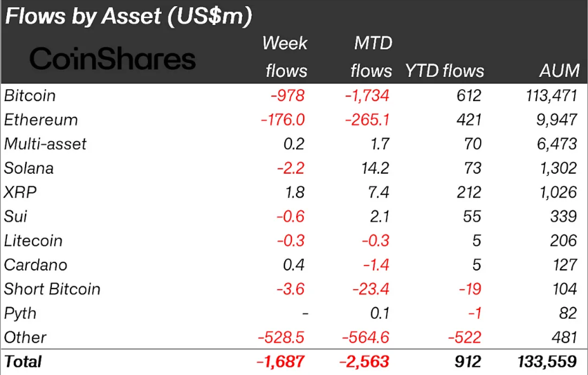 Hisobotga ko’ra, umumiy kripto chiqishlari $1.687 milliardga yetdi, bu salbiy tendensiya davomida umumiy yo’qotishlarni $6.4 milliardga olib keldi. Bu 2015 yildan beri kapital chiqishlarining eng uzoq davom etgan uzluksiz davrini belgilaydi.