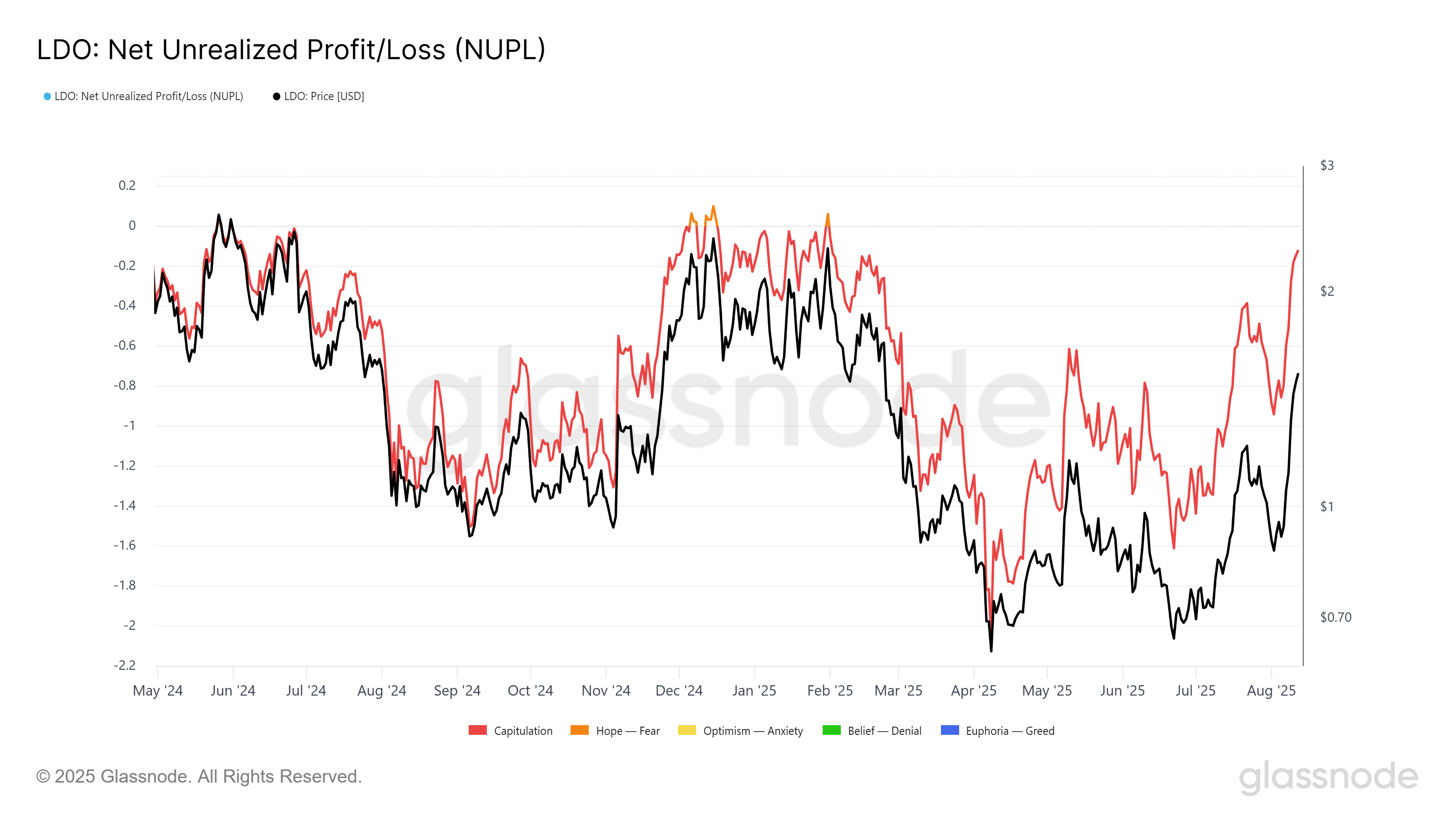 LDO uchun NUPL (Net Unrealized Profit/Loss – Sof amalga oshirilmagan foyda/zarar) indikatori muhim chegaraga yaqinlashmoqda. Tarixan, NUPL 0 ga yetganda, bu ko’pincha o’zgarish nuqtasi sifatida xizmat qilgan. Bu shuni anglatadiki, LDO kuchli o’sish sur’atlarini boshdan kechirayotgan bo’lsa-da, agar NUPL bu neytral zonani kesib o’tsa, narx pasayishi mumkin.