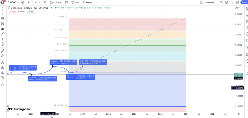 Kutilgan 2029 yilgi past va 2026 yilgi yuqori darajalarni swing past va swing highs sifatida hisobga olib, DOGE 2030 yil oxiriga borib $2.81 darajasiga yetishi mumkin. Ekstrapolyatsiyasiz ham, 2029 yilga mo’ljallangan eng yuqori ko’rsatkich $1.66 bo’lib, 2030 yilga kelib DOGE qiymati $2.50 dan oshishi kutilmoqda.