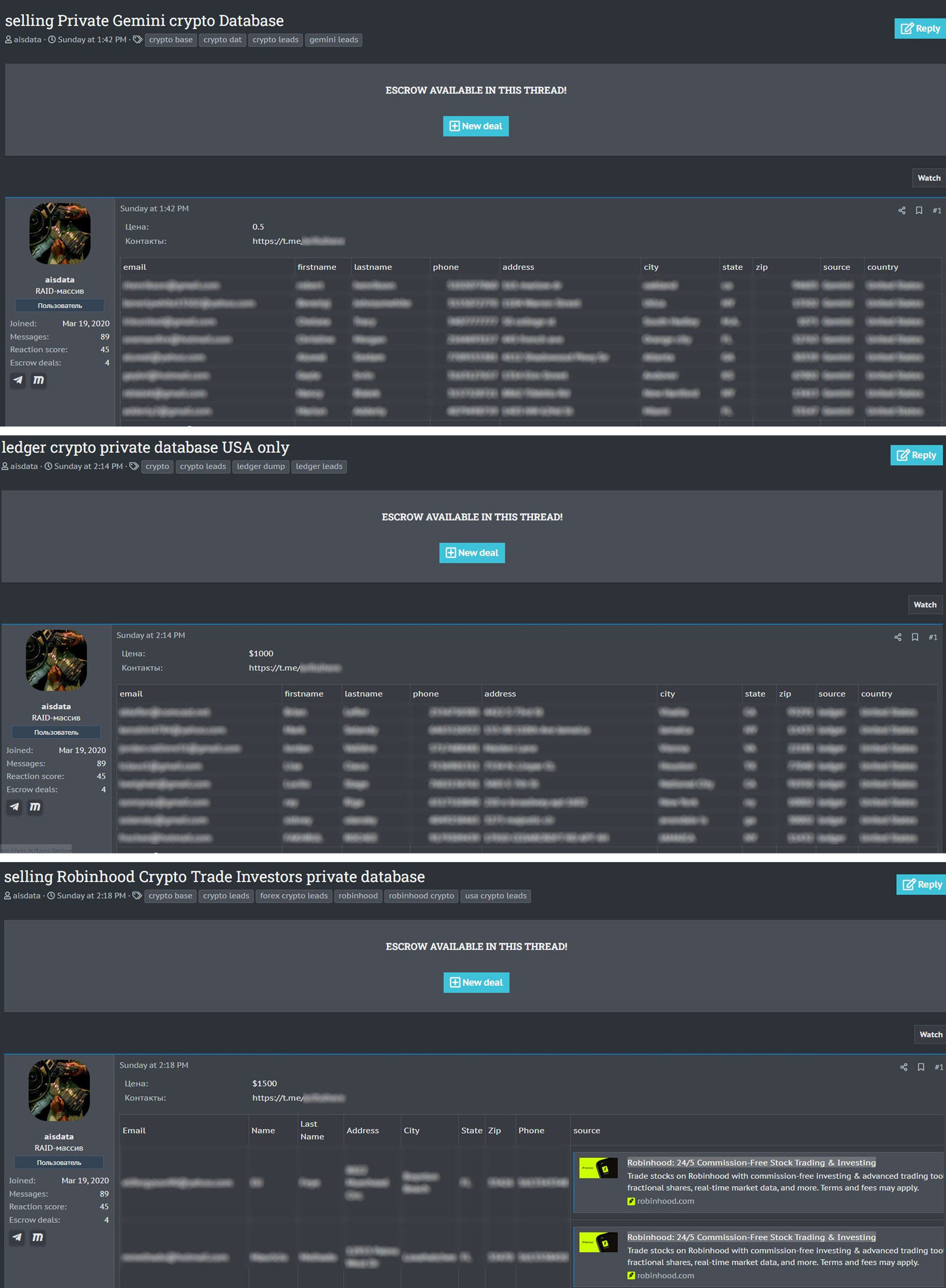 X (ilgari Twitter) platformasidagi Dark Web Informer akkaunti yaqinda xavotirli yangilikni ulashdi. Bir akkaunt Ledger, Gemini va Robinhood kabi mashhur kripto platformalaridan ma’lumotlarni sotayotganini da’vo qildi.