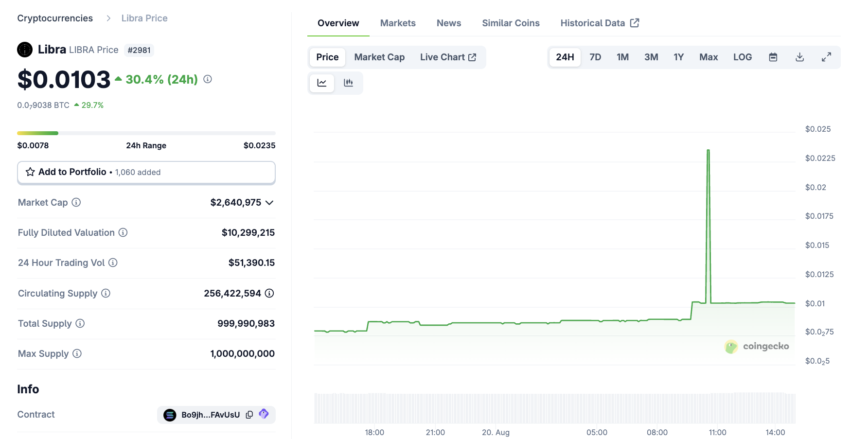 AQSh Federal sudyasi LIBRA memkoinining targ’ibotchilari Xayden Devis va Ben Chouning 57,5 million dollarini muzlatib qo’ygan edi, ammo bu mablag’lar yana ochildi va memkoinning narxi qisqa vaqtga ko’tarildi. Sudya Rochon bu kishilarga qarshi da’vo umuman muvaffaqiyatsiz bo’lishi mumkinligini ogohlantirdi.