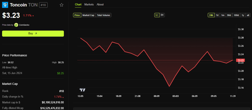 Shunga qaramay, TON TVL (umumiy qulflangan qiymat) deyarli 2% ga kamayib, so’nggi 24 soat ichida $136.2 millionga tushdi. Xuddi shunday, Toncoin (TON) narxi ham so’nggi 24 soat ichida deyarli 2% ga pasayib, ushbu yozuv paytida $3.23 ga savdo qilinmoqda.