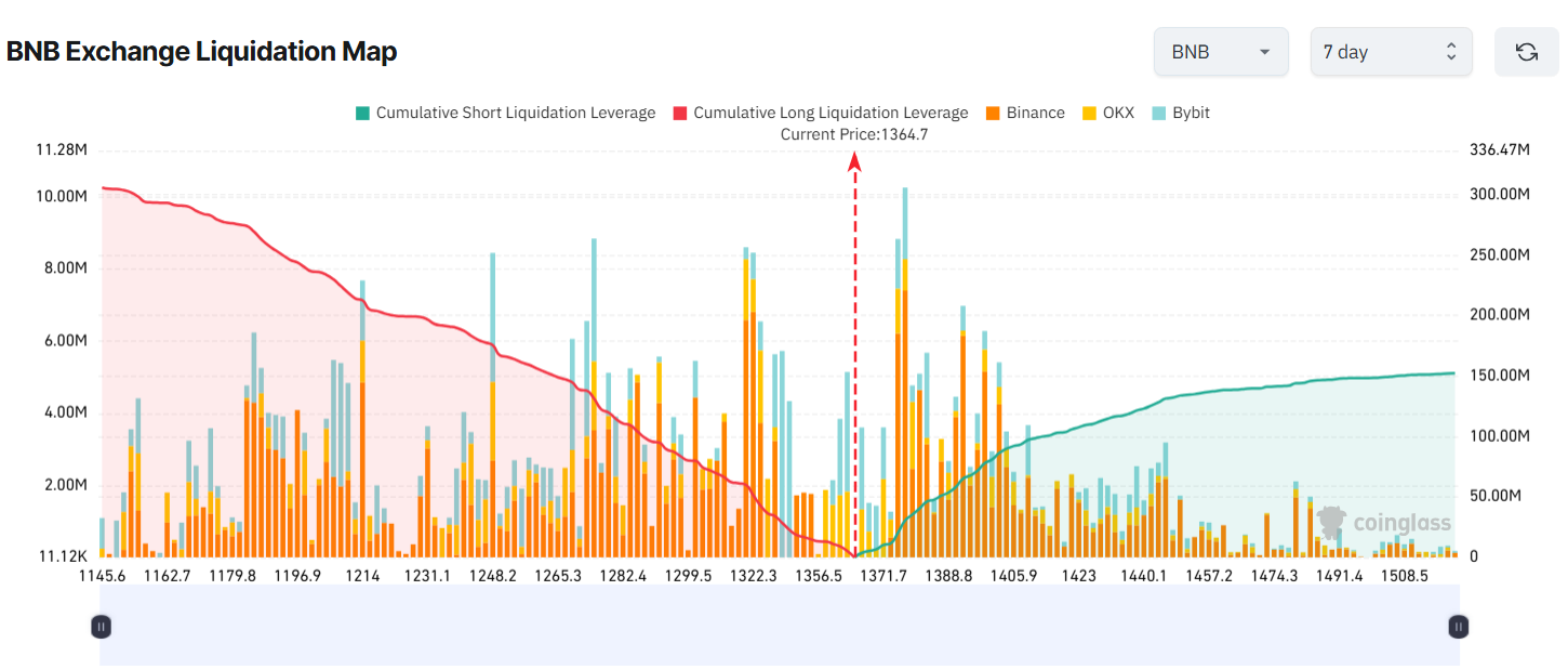 Agar BNB bu hafta 1,150 dollarga tushsa, uzun savdogarlar 300 million dollardan ortiq likvidatsiyaga duch kelishi mumkin. Aksincha, agar BNB 1,500 dollardan oshib, yangi yuqori narxni o’rnatsa, taxminan 150 million dollarlik qisqa pozitsiyalar likvidatsiya qilinadi.