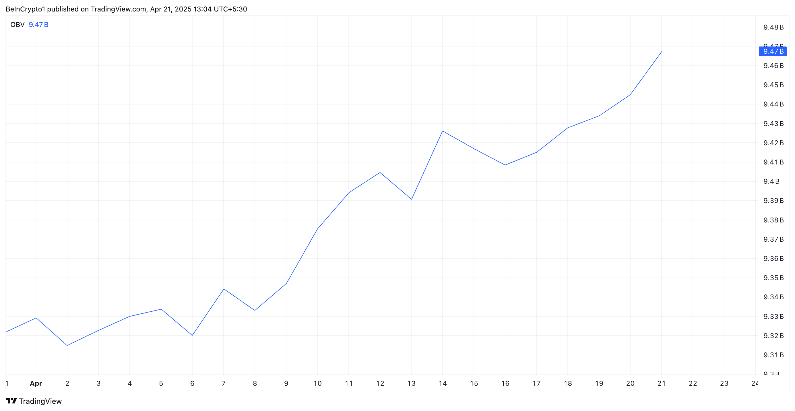 MANA/USD bir kunlik jadvalini tahlil qilish tokenning balansdagi hajmi (OBV) barqaror o’sayotganini ko’rsatadi. Bu uning talabining oshganini aks ettiradi. Ushbu harakat ko’rsatkichi matn yozilayotgan paytda 9.47 milliardga yetdi, bu 2024 yil dekabrdan beri eng yuqori darajadir.