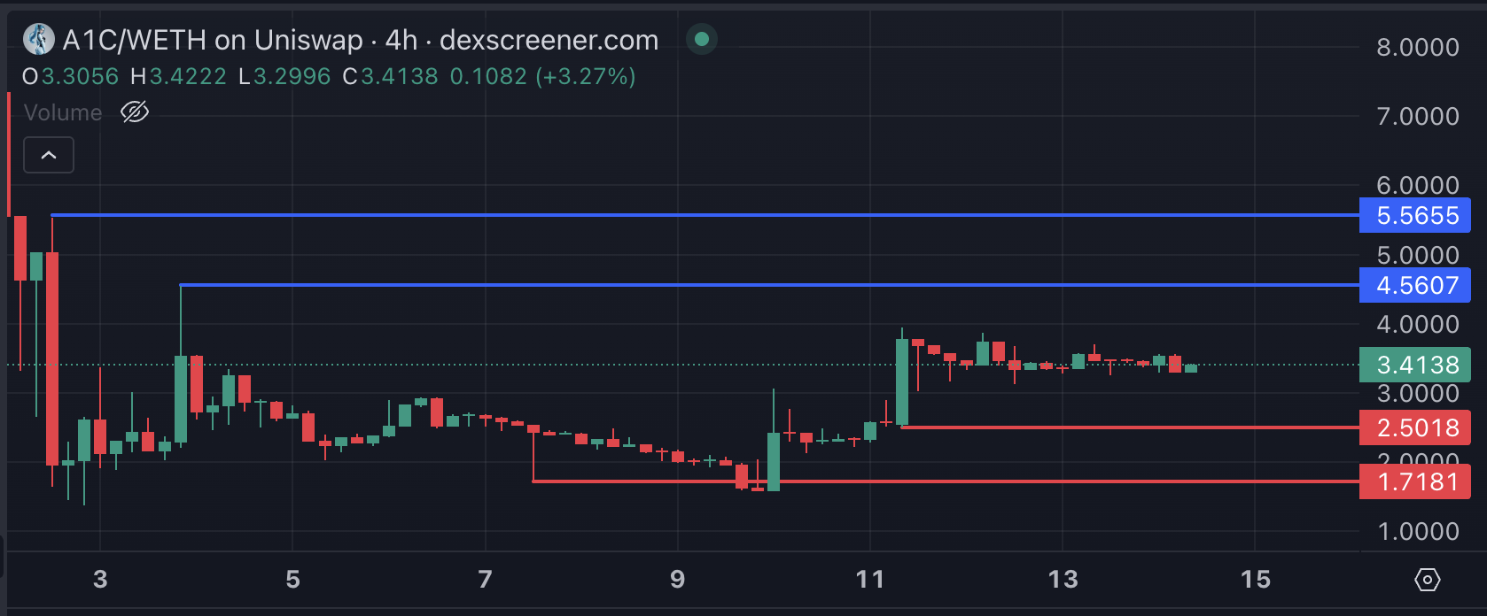 A1C so’nggi yetti kun ichida 33% ga oshdi va uning bozor qiymatini 35 million dollarga yetkazdi. Agar o’sish tendensiyasi davom etsa, token keyingi qarshilik sifatida $4.56 ni nishonga olishi mumkin, bu esa $5.56 ga olib kelishi mumkin.