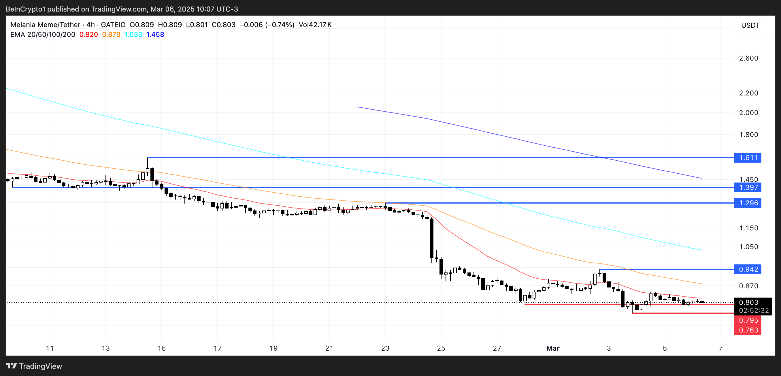 Pastga qarab, agar sotish davom etsa, MELANIA $0.795 va $0.763 dan pastga tushishi mumkin, va $0.7 dan pastga tushish yangi rekord past darajalarni o’rnatadi.