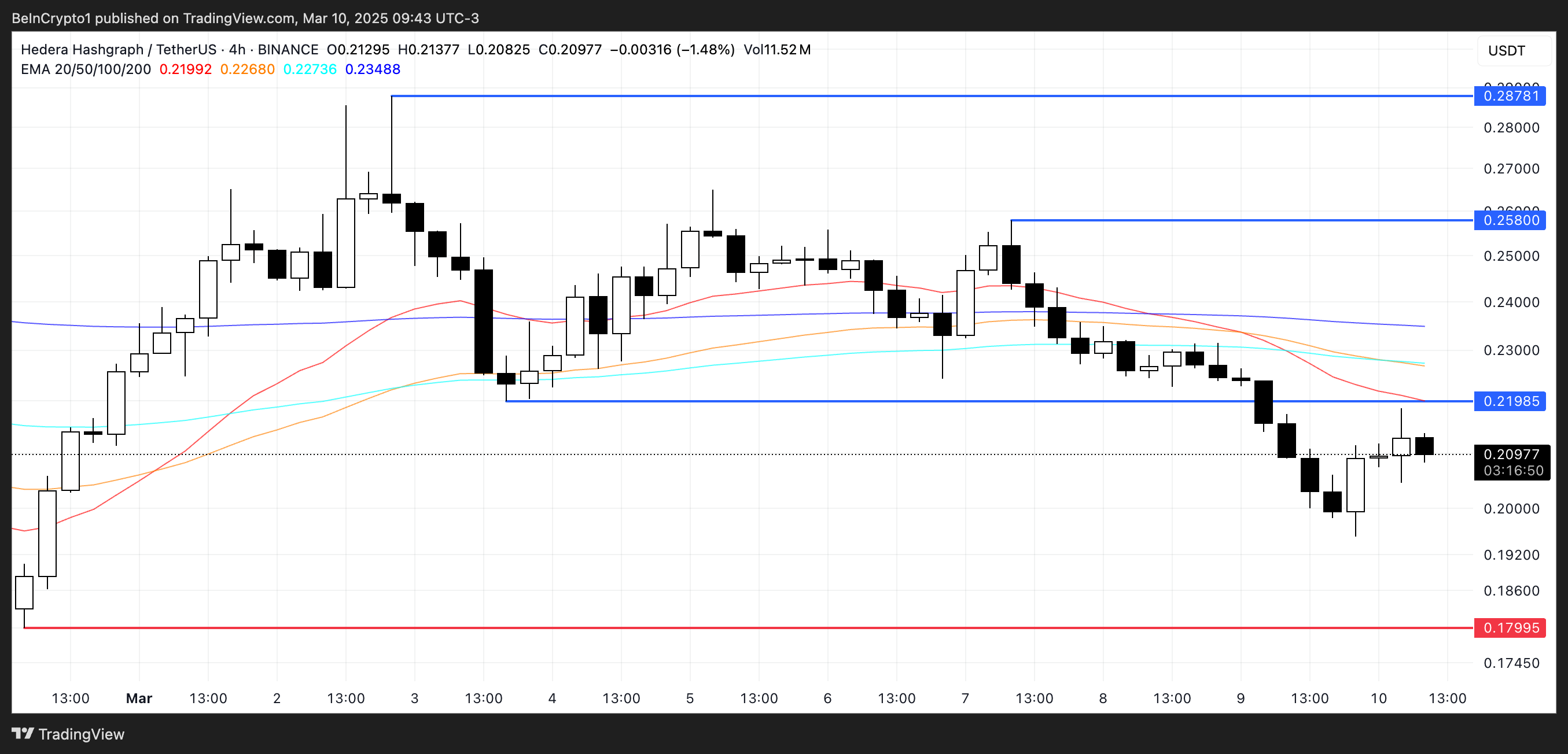 Agar HBAR o’sish tendensiyasini o’rnatishi mumkin bo’lsa, u $0.219 va $0.258 da muhim qarshilik darajalarini sinab ko’rishi mumkin, kuchliroq rally esa uni $0.287 ga olib borishi mumkin. Biroq, agar joriy narx qaytishi chuqurlashsa, u qo’shimcha pasayish xavfi bilan duch kelishi mumkin.