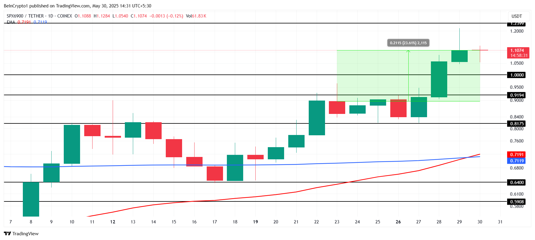 Mem koin sifatida, SPX yuqori o’zgaruvchanlikka duch keladi. Biroq, EMAlar Oltin Kesish hosil qilmoqda, bu esa potentsial ko’tarilishni bildiradi. Ushbu texnik naqsh ko’tarilish tendensiyasini davom ettirishi va SPXni $1.23 qarshilik darajasidan o’tkazishi mumkin.