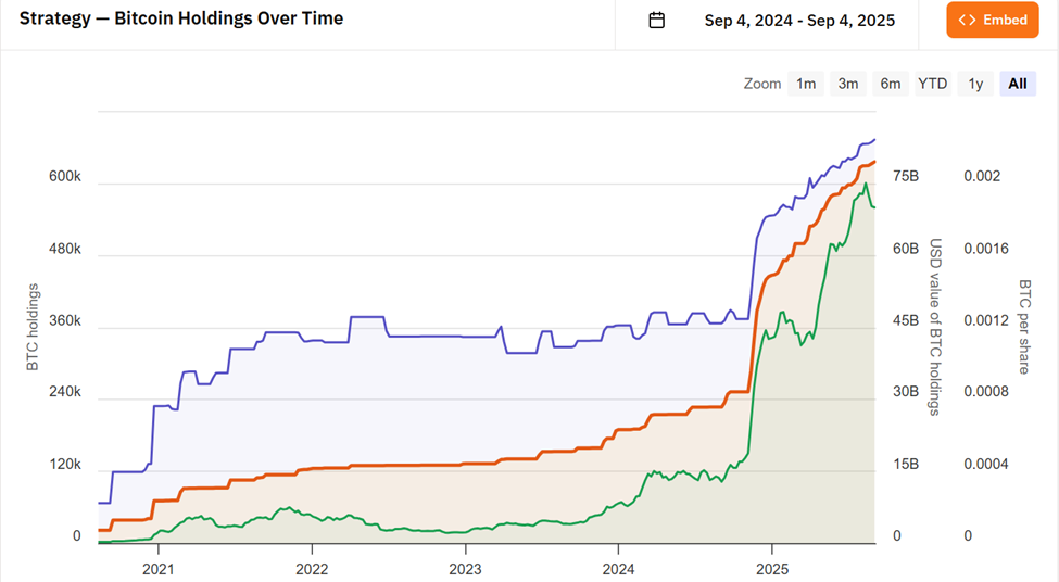 So’nggi uch yil ichida “Strategy” o’zining avvalgi kimligini asta-sekin tark etdi. Investorlar endi kompaniyani naqd pul oqimlari asosida emas, balki faqat uning 636,505 Bitkoin zaxiralari va Saylornining monetizatsiya qobiliyati asosida baholaydilar.