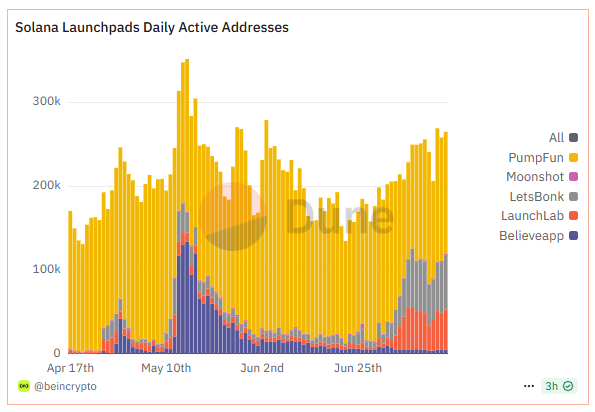 Uchinchi sabab – iyul oyida Solana platformasida yangi mem tokenlarning ko’payishi. Bu faoliyatning katta qismi Letsbonk.fun platformasidan kelib chiqmoqda. «Dune» ma’lumotlariga ko’ra, BeInCrypto tomonidan taqdim etilgan, 16 iyulda Letsbonk.fun platformasida 19,900 token yaratilgan — bu tarixiy maksimum.