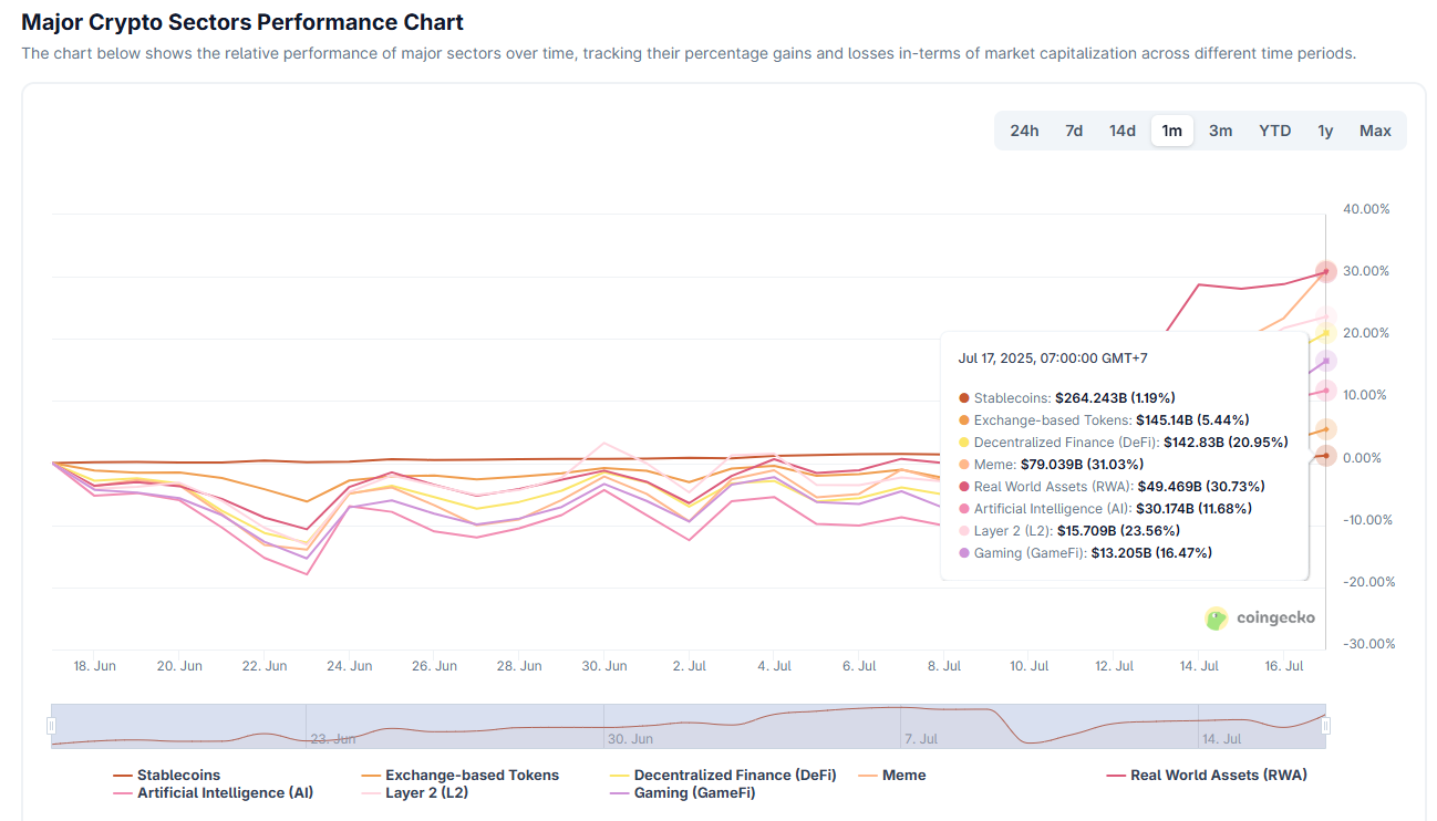 «CoinGecko» ma’lumotlariga ko’ra, o’tgan oyda memkoinlar 31% daromad keltirdi va boshqa barcha sektorlarni ortda qoldirdi. 2024 yil bilan solishtirganda, 31% hali ham kamtarona raqam. Bundan tashqari, bu daromad asosan BONK va PENGU kabi ajralib turuvchi memkoinlardan kelib chiqdi. Hozircha bu o’sish butun memkoin bozorida keng tarqalmagan.