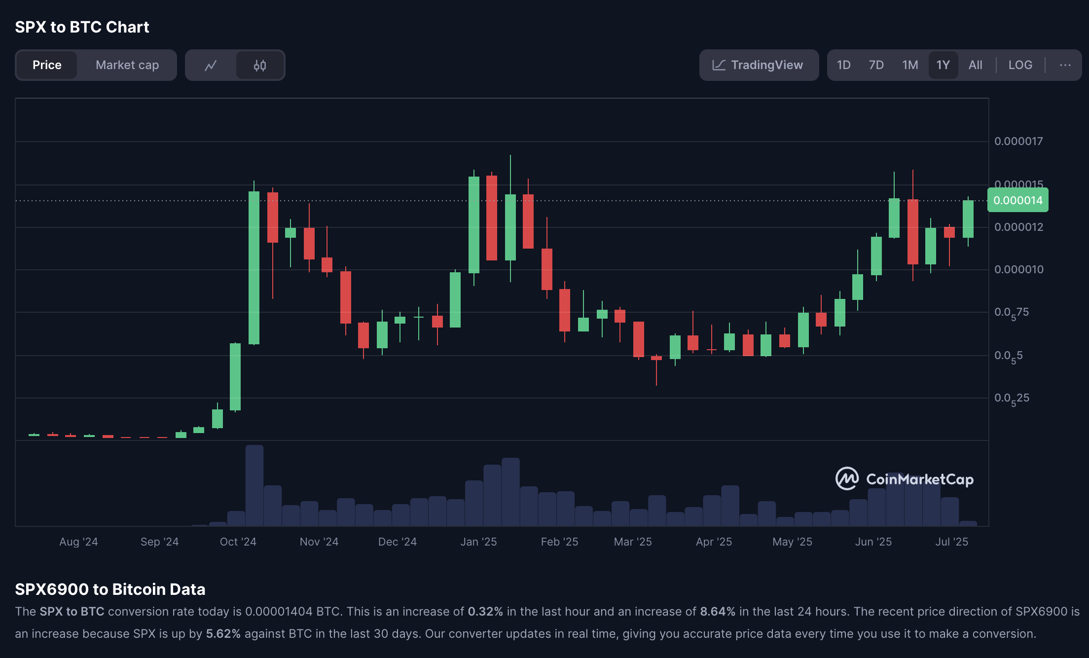 O’tgan hafta davomida «SPX» «Bitkoin»ga nisbatan yaxshiroq natija ko’rsatdi. Bu holat odatda «memkoin» tsikllarida kamdan-kam uchraydi, chunki ular tarixan «Bitkoin»ning o’zgaruvchanligiga ergashadi.
