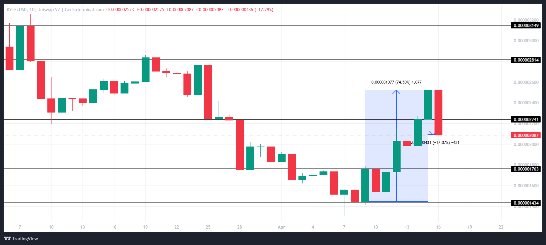 BYTE narxi so’nggi 24 soatda 17% ga pasaydi, ammo o’tgan hafta 74% ga ko’tarilgan edi. Hozirda $0.000002087 narxda savdo qilinmoqda va bu AI asosidagi meme tanga bozor noaniqligiga duch kelmoqda.