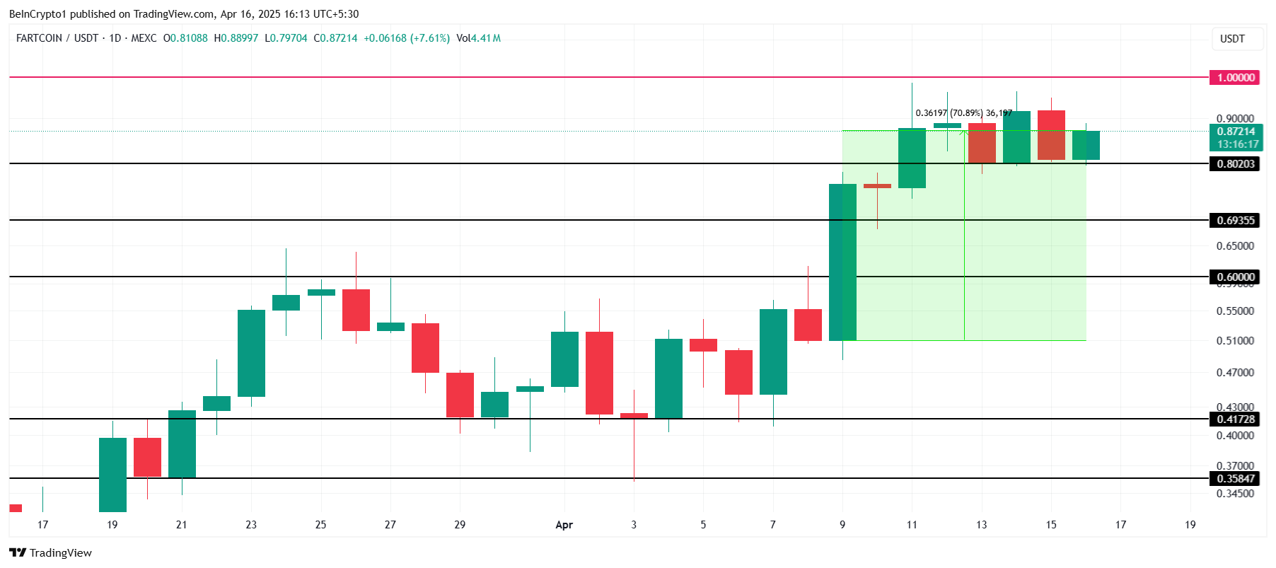 Narx $0.80 qo’llab-quvvatlash darajasidan yuqorida turganligi sababli, FARTCOIN potentsial o’sishga tayyor. Altkoin $1.00 darajasini bosib o’tishga yaqinlashmoqda va agar buqa bozor hissiyoti davom etsa, narx yanada oshishi mumkin.