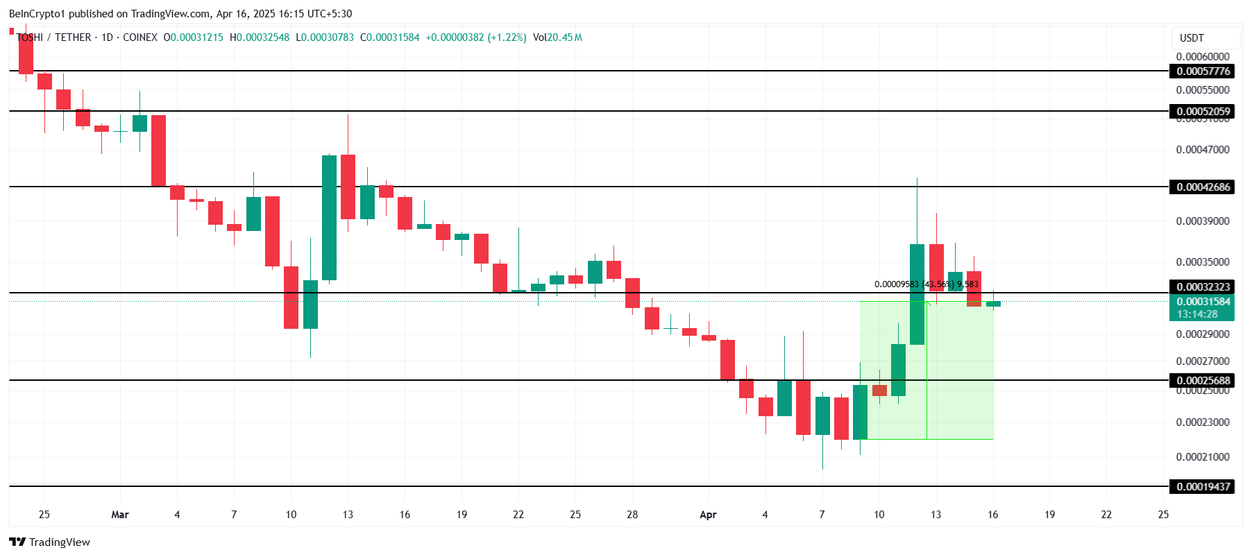 Agar TOSHI $0.000323 qo‘llab-quvvatlash darajasini qayta tiklasa, bu meme tanga yana yuqoriga ko‘tarilishi mumkin. Barqaror qo‘llab-quvvatlash TOSHIni $0.000426 qarshilik darajasiga yetkazishi mumkin. Bu investorlar uchun foyda olish imkoniyatini yaratadi va qisqa muddatda tangaga ijobiy qarashni mustahkamlaydi.