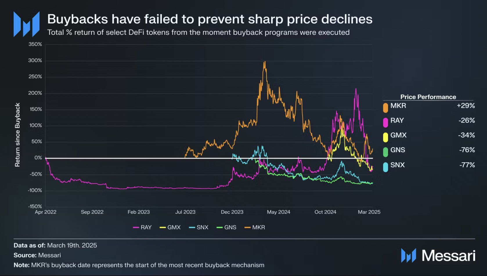 Messari tomonidan o’tkazilgan so’nggi tahlil shuni ko’rsatdiki, tokenlarni qayta sotib olish dasturlari, ko’pincha barqarorlashtiruvchi mexanizm sifatida e’lon qilinadi, bir nechta yirik tokenlar uchun keskin narx pasayishining oldini olishda muvaffaqiyatsizlikka uchradi.