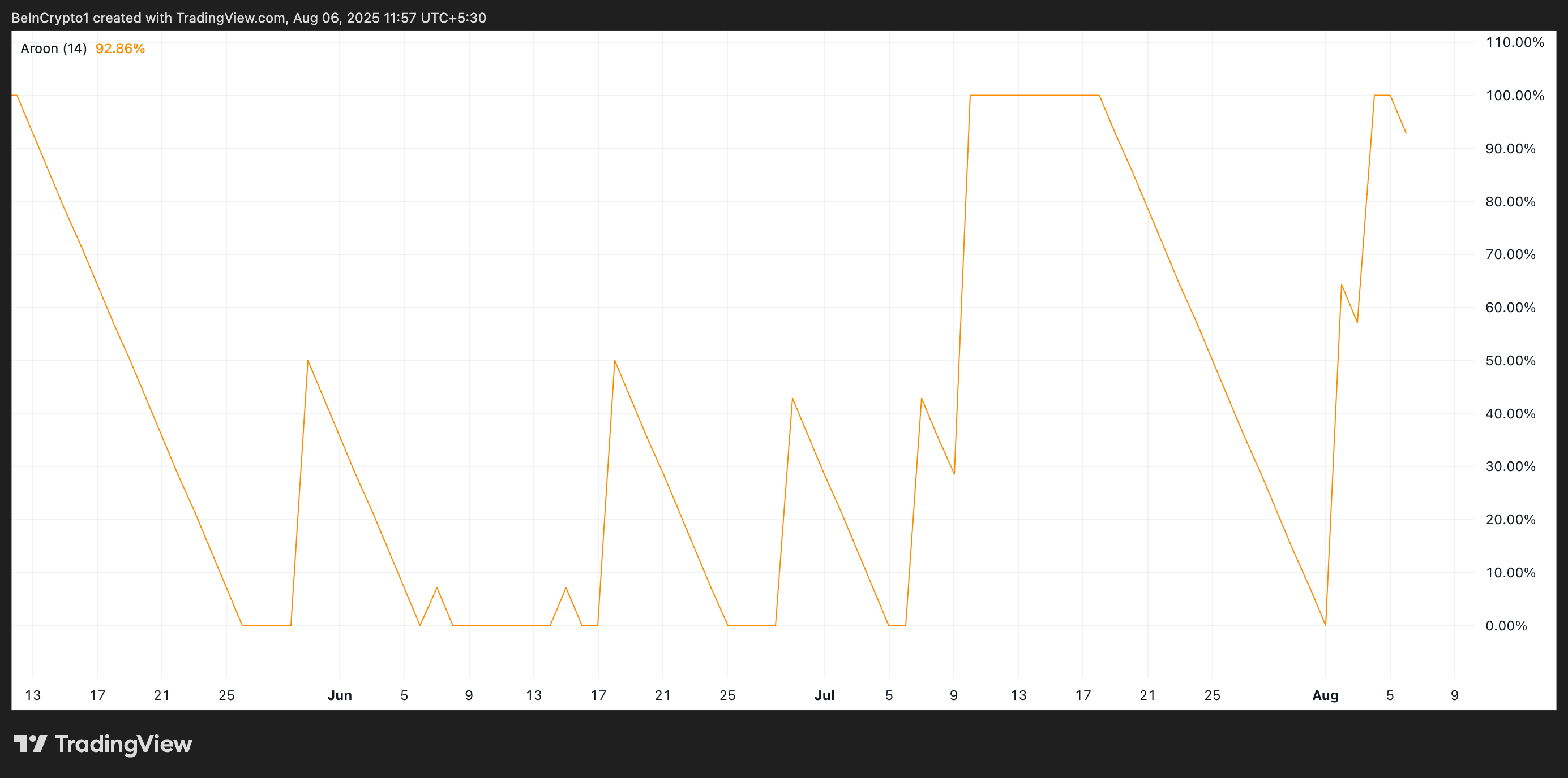 Agar Aroon Up chizig’i 100% ga yaqin bo’lsa, bu so’nggi narx harakati doimiy ravishda yangi yuqori nuqtalarga yetganligini ko’rsatadi, bu esa kuchli o’sish harakatini bildiradi. Bu MNT uchun to’g’ri, uning narxi so’nggi uch kun ichida besh oylik eng yuqori nuqtaga ko’tarildi.