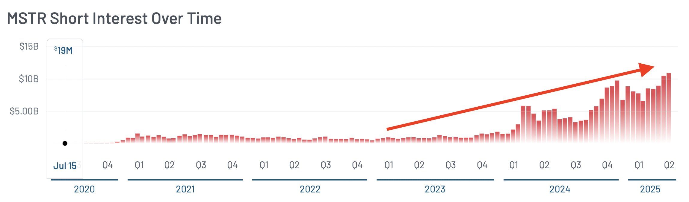 Bu orada, qisqa foizlardagi ATH ayniqsa yuqori ayirbosh hissiyotini ko’rsatadi. Bozor kuzatuvchisi, Lyuk Mikik, yaqinda «X» (ilgari «Twitter» ijtimoiy tarmog’i) da grafikni ulashdi va MSTR qisqa foizlari 2025 yilning ikkinchi choragida ATH ga yetganini ko’rsatdi.