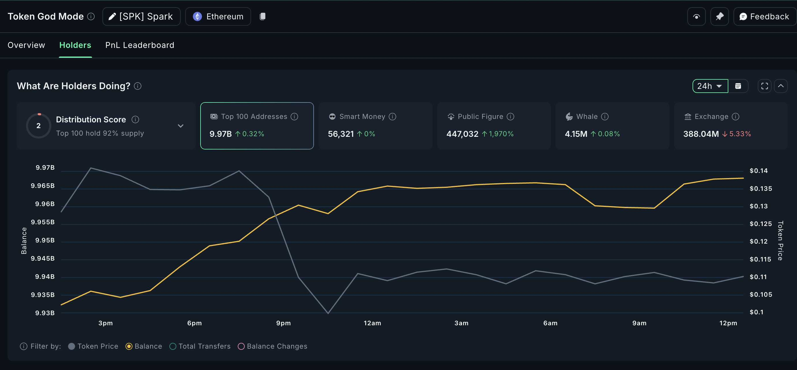 Sotuvchilar chekinayotganining birinchi belgilaridan biri birja balanslarining yaqinda pasayishi bo’ldi. So’nggi 24 soat ichida SPK birja zaxiralari 5.33% ga yoki taxminan 21 million tokenga kamaydi. Bu esa darhol sotish uchun kamroq tokenlar mavjudligini anglatadi.