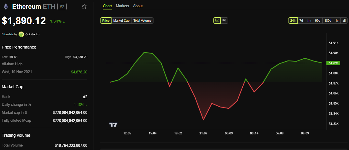 BeInCrypto ma’lumotlariga ko’ra ETH ushbu yozuv paytida $1,890 ga savdo qilinmoqda, so’nggi 24 soat ichida 1.34% ga o’sdi.