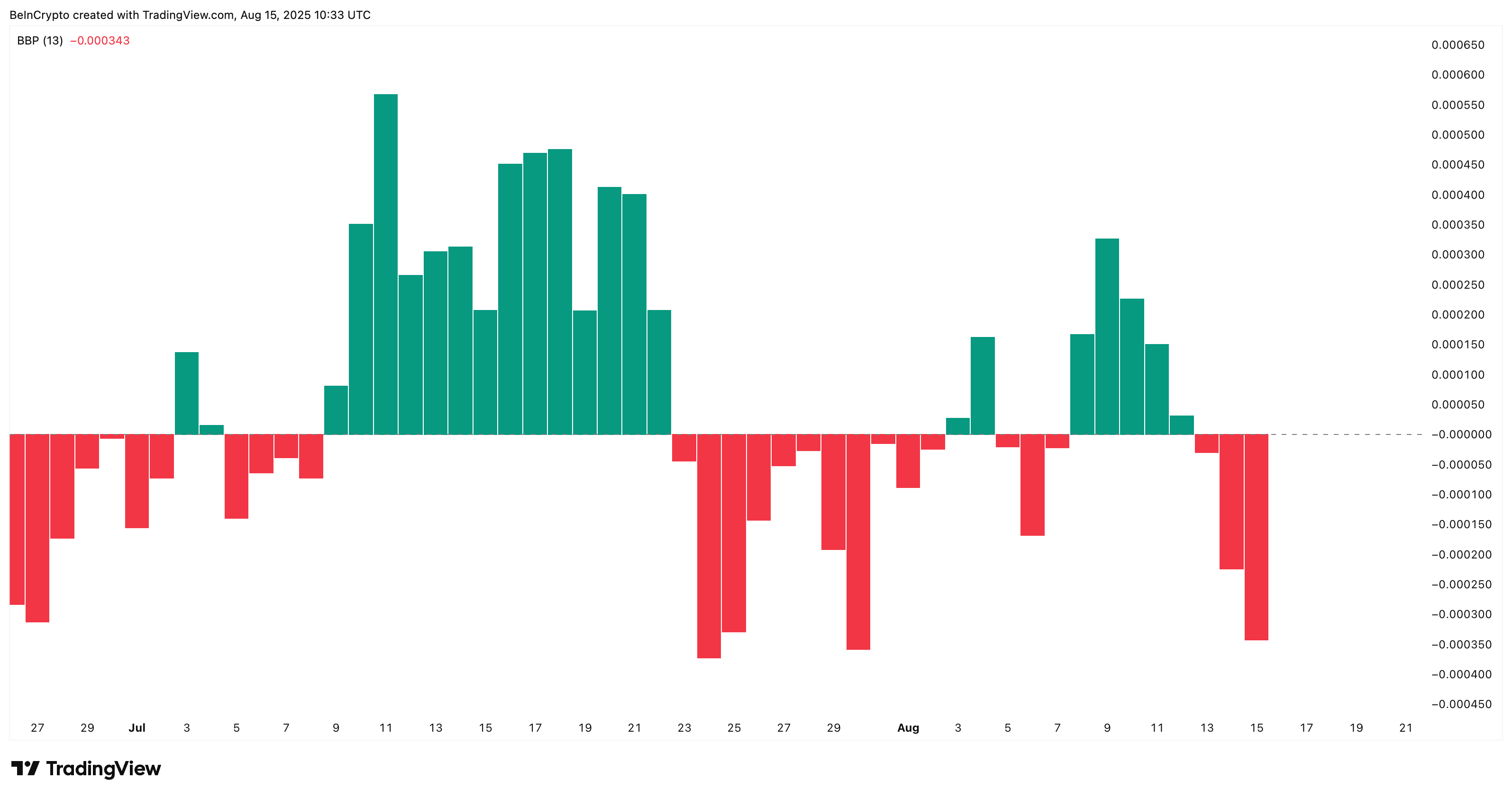 Grafikdagi yagona ijobiy belgi Chaikin Pul Oqimi (CMF) dan keladi. 5-avgustdan 14-avgustgacha narx pastroq pastlikni hosil qilgan bo’lsa-da, CMF yuqoriroq pastlikni ko’rsatdi — bu sotish bosimi kamayishi mumkinligining dastlabki belgisi.