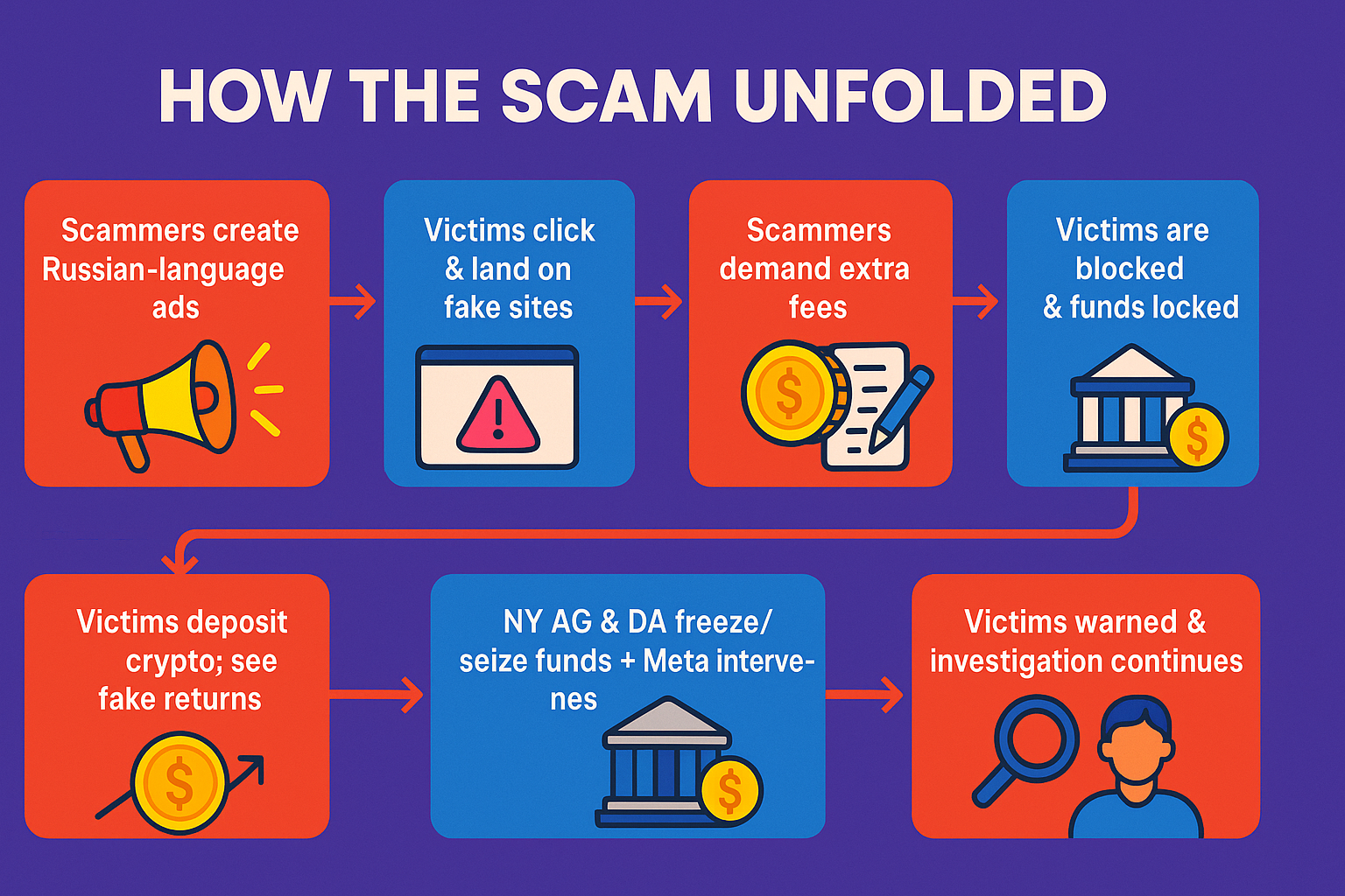 «Nyu-York Bosh prokurori Letitsiya Jeyms ijtimoiy tarmog’i orqali amalga oshirilgan kripto firibgarlik tarmog’iga qarshi kurash e’lon qildi. Politsiya 300,000 dollar miqdoridagi aktivlarni muzlatdi va yana 140,000 dollarni, shuningdek, domen nomlari va elektron pochta manzillarini qo’lga kiritdi.