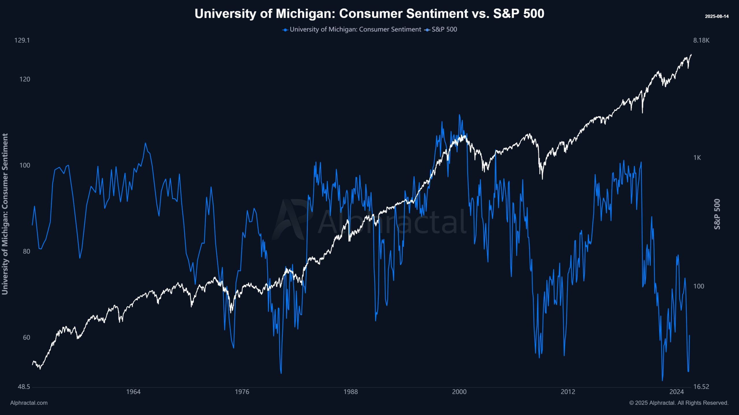 Iste’molchilar ishonchi ko’p yillik past darajaga tushib ketgan, ammo S&P 500 indeksi o’sishda davom etmoqda. Bu jamoatchilikning iqtisodiy tasavvuri va investorlarning bozor optimizmi o’rtasidagi farqni ko’rsatadi.