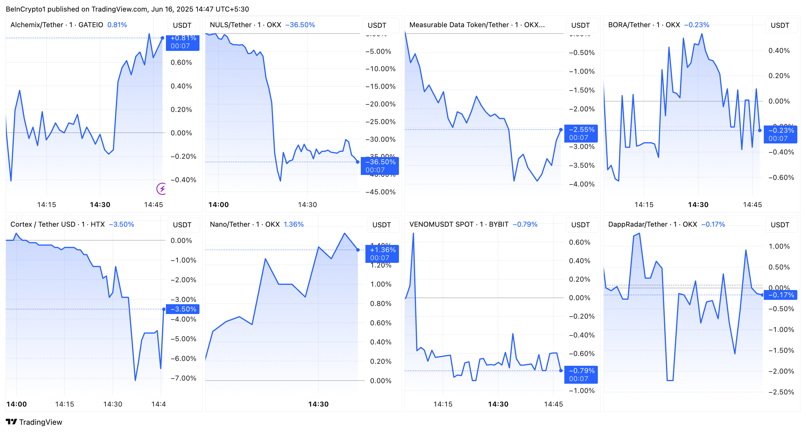 RADAR va MDT mos ravishda 5.6% va 4.2% ga pasayishlarni boshdan kechirdi, BORA va VENOM esa 2.0% va 1.5% ga kamroq yo’qotishlarni ko’rsatdi. Boshqa tokenlar kabi, ular ham matbuot vaqtida biroz tiklanish ko’rsatdi.