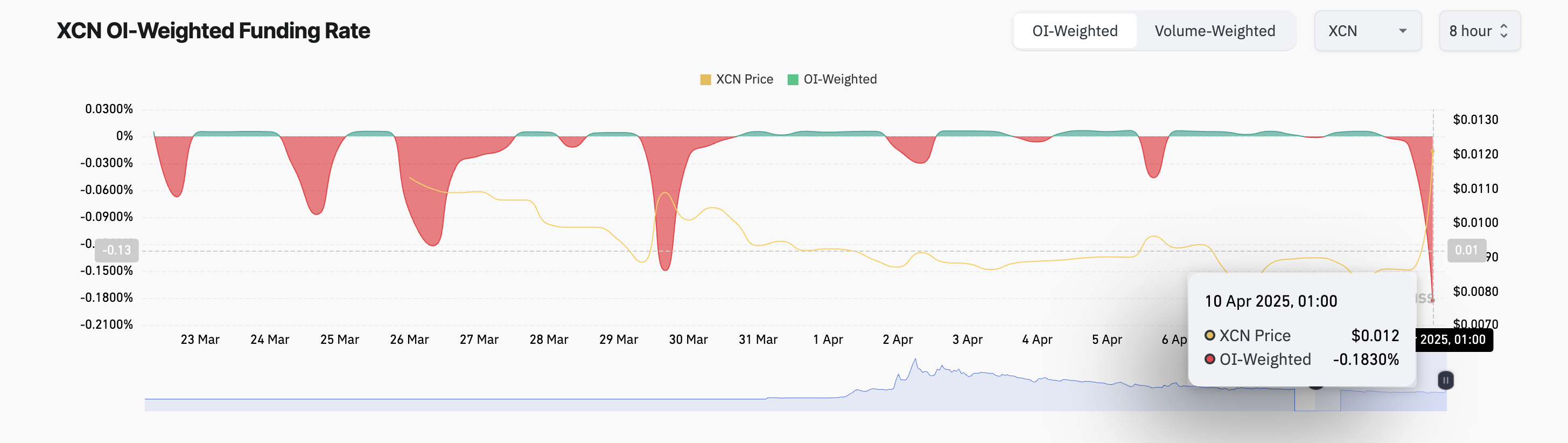 Aktivning moliyalashtirish stavkasi bu kabi salbiy bo’lsa, qisqa treyderlar uzoq treyderlarga pul to’laydilar. Bu düşüş kayfiyatini va ko’proq XCN treyderlari narxning tushishiga pul tikayotganini ko’rsatadi.