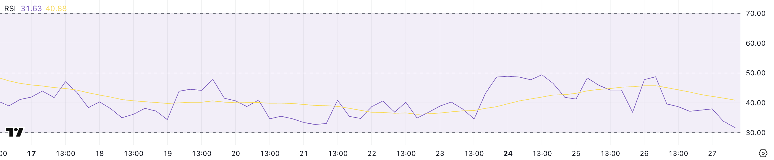 RSI – bu 0 dan 100 gacha bo’lgan shkalada narx harakatlarining tezligi va o’zgarishini o’lchaydigan momentum osilatoridir. 70 dan yuqori o’qishlar odatda aktiv haddan tashqari sotib olinganligini va tuzatish kerakligini ko’rsatadi, 30 dan past qiymatlar esa potentsial qayta tiklanishga olib kelishi mumkin bo’lgan haddan tashqari sotilgan sharoitlarni ko’rsatadi.