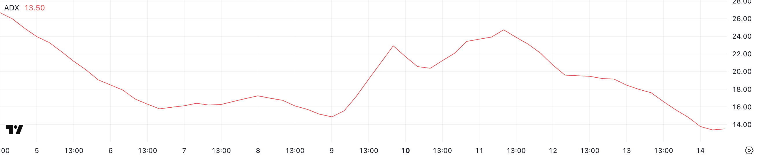 Pasayish trendida past ADX odatda sotish bosimining zaiflashayotganini anglatadi. Biroq, narx keskin tiklanish o’rniga xarid qilish faolligi sezilarli darajada oshmasa, yon tomonga harakat qilishda davom etishi mumkin.
