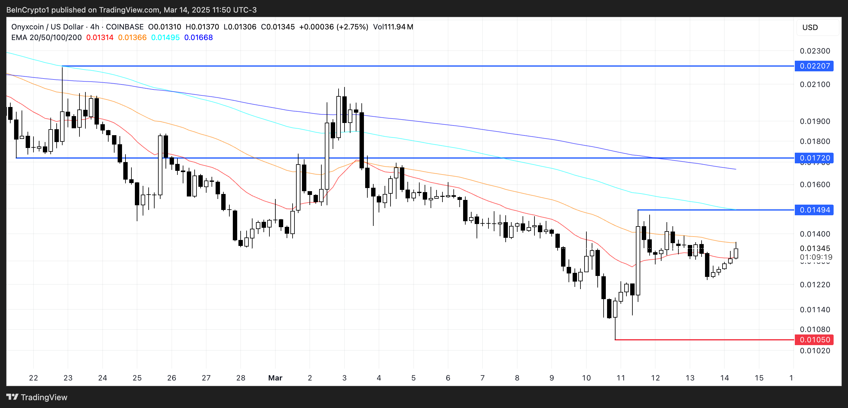 Ushbu nuqtadan pastga tushish muhim bo’ladi, chunki Onyxcoin 17-yanvardan beri $0.010 dan past savdo qilmagan.