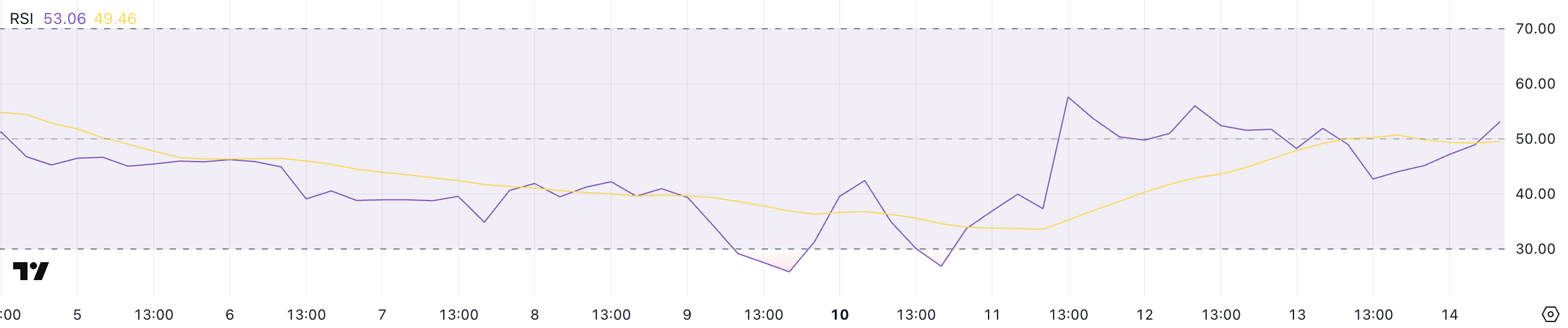 Onyxcoin Nisbiy kuch indeksi (RSI) 53 ga ko’tarilib, bir kun oldin 42.6 dan keskin ko’tarildi. Bu o’sish moment o’zgarishini ko’rsatadi, bu nisbiy zaiflik davridan keyin xarid qilish bosimi qaytayotganini bildiradi.