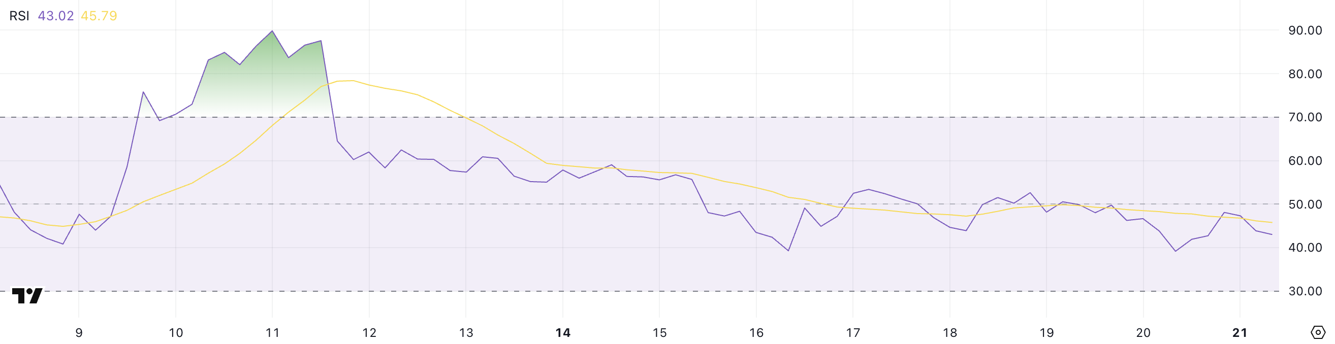 Onyxcoinning Nisbiy kuch indeksi (RSI) hozirda 43 darajada. 70 dan yuqori ko’rsatkichlar odatda aktiv haddan tashqari sotib olinganligini va orqaga qaytish ehtimolini bildiradi. 30 dan past ko’rsatkichlar esa aktiv haddan tashqari sotilganligini va qayta tiklanish ehtimolini ko’rsatadi.