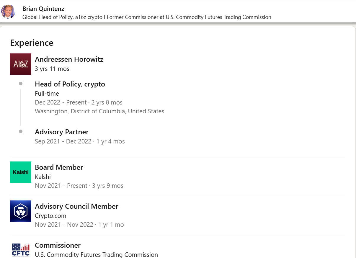 Fevral oyining boshida Prezident Donald Tramp venchur kapital firmasi «a16z» siyosat bo’limi rahbari Brayan Kvintenzni CFTC rahbari etib tayinlashni taklif qildi.
