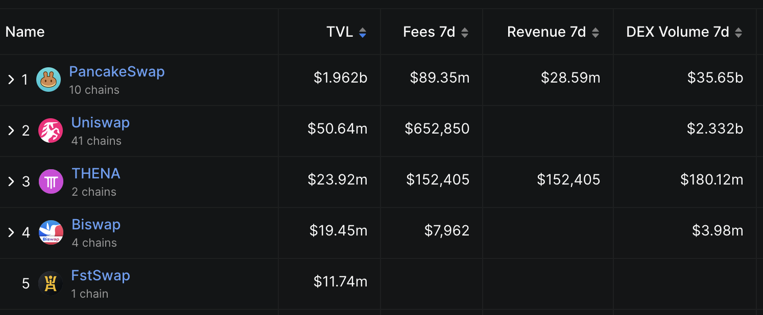 Nega BNBning o’sishi «PancakeSwap»ga ta’sir qilishi mumkin? DefiLlama ma’lumotlariga ko’ra, «PancakeSwap» hozirda zanjirda umumiy qiymat (TVL) va savdo hajmi bo’yicha eng yaxshi DEX hisoblanadi. Ekotizimdagi kuchli pozitsiyasi platformani BNB o’sishidan asosiy foyda oluvchi qiladi.