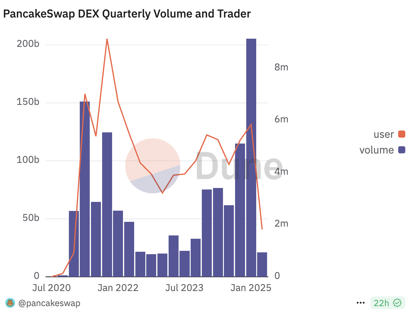 Diqqatga sazovor tomoni shundaki, bu o’sish yangi emas, balki 2023 yildan beri barqaror ravishda o’sib kelmoqda. So’nggi ikki yilda, «PancakeSwap»ning choraklik savdo hajmi 2023 yilning birinchi choragidagi 20,1 milliard dollardan 2025 yilning birinchi choragida 205,3 milliard dollarga ko’tarildi. Bu 922% o’sishni anglatadi.