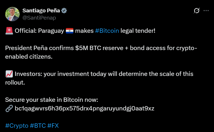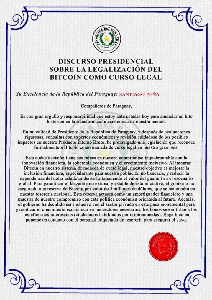 Paragvay Prezidenti Santyago Penyaning «X ijtimoiy tarmog’i»dagi tvitida mamlakat Bitkoinni qonuniy to’lov vositasi sifatida qabul qilgani aytilgan. Postda Paragvay 5 million dollarlik Bitkoin zaxirasini yaratgani haqida prezident farmoni ko’rinishidagi grafik tasvir keltirilgan.