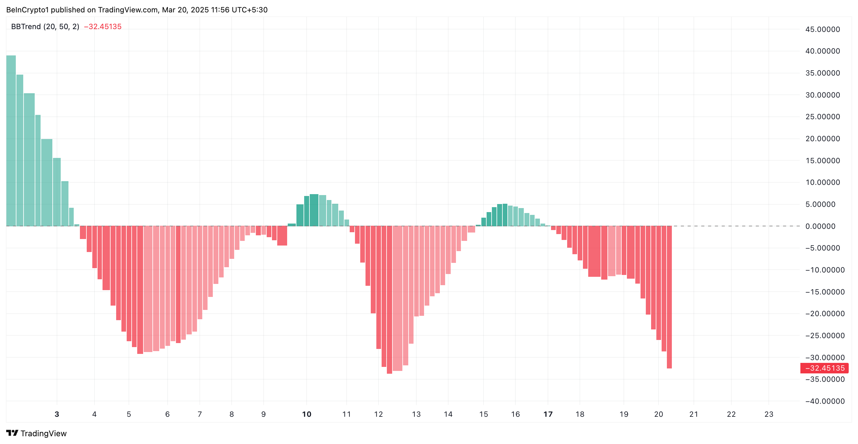Aksincha, salbiy BBTrend qiymati pasayishni bildiradi, bu aktivning pastki bantga yaqinroq savdo qilayotganligini va ayirboshlash bosimi ustunligini ko’rsatadi.