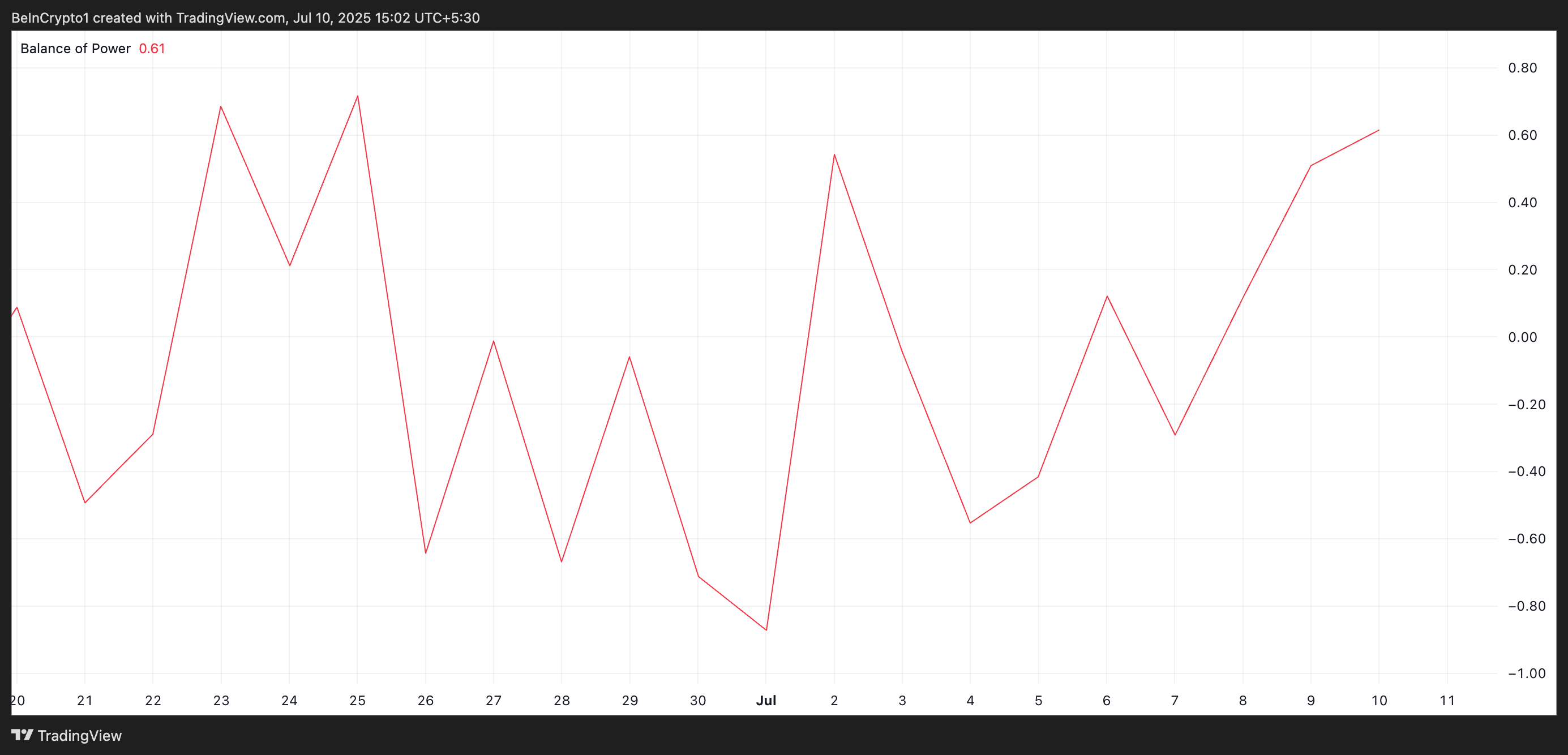 BoP indikatori bozorida sotuvchilar va xaridorlar kuchini o’lchaydi. Bu esa impuls o’zgarishlarini aniqlashga yordam beradi. Uning qiymati manfiy bo’lsa, sotuvchilar bozorni nazorat qiladi va xaridorlar qarshiligi kam bo’ladi.