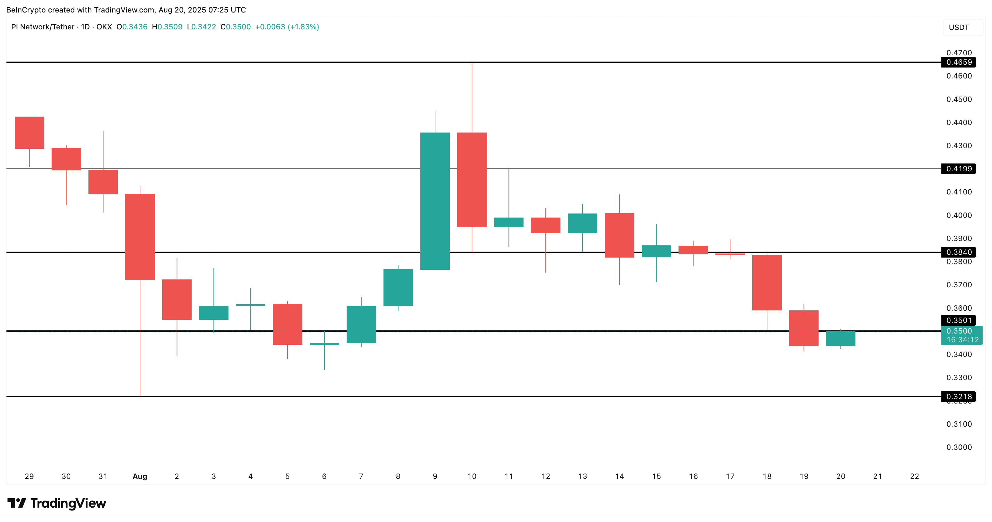 Hozirda Pi Coin narxi $0.35 atrofida savdo qilinmoqda, asosiy qo’llab-quvvatlash darajasidan biroz yuqorida turibdi. Bu qo’llab-quvvatlash zonasi bir necha marta sinovdan o’tgan. Agar sotuvchilar bu darajani buzib o’tsa, $0.32 dan pastga tushish tezda yangi pastliklarni ochishi mumkin.