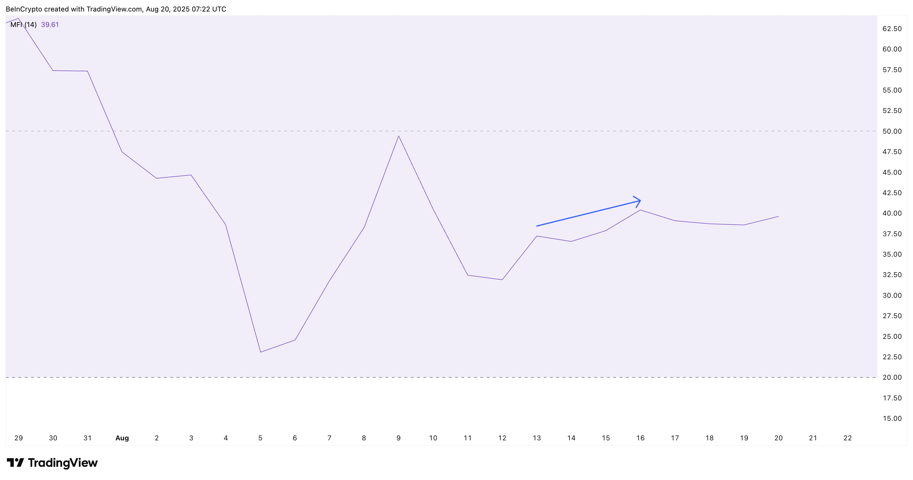 Hozirda MFI 40 belgidan pastda qolmoqda. Ammo agar u kelgusi kunlarda 40 dan yuqoriga chiqsa, bu ketma-ket ikki yuqoriroq cho’qqini o’rnatadi. Agar tasdiqlansa, bu sotuvchilar chekinishni boshlayotganining birinchi belgisi bo’lishi mumkin.