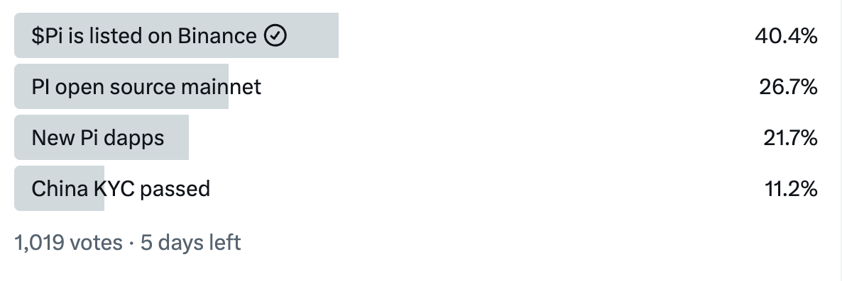 «X» ijtimoiy tarmog’ida (ilgari «Twitter») o’tkazilgan so’rovda, Pionerlar orasida 40% dan ortiq respondentlar Pi Coin (PI) Pi2Dayda «Binance» birjasida ro’yxatga olinadi deb ishonishadi. PI foydalanuvchilari bu voqeani «Open Network» ishga tushirilganidan beri kutishmoqda.