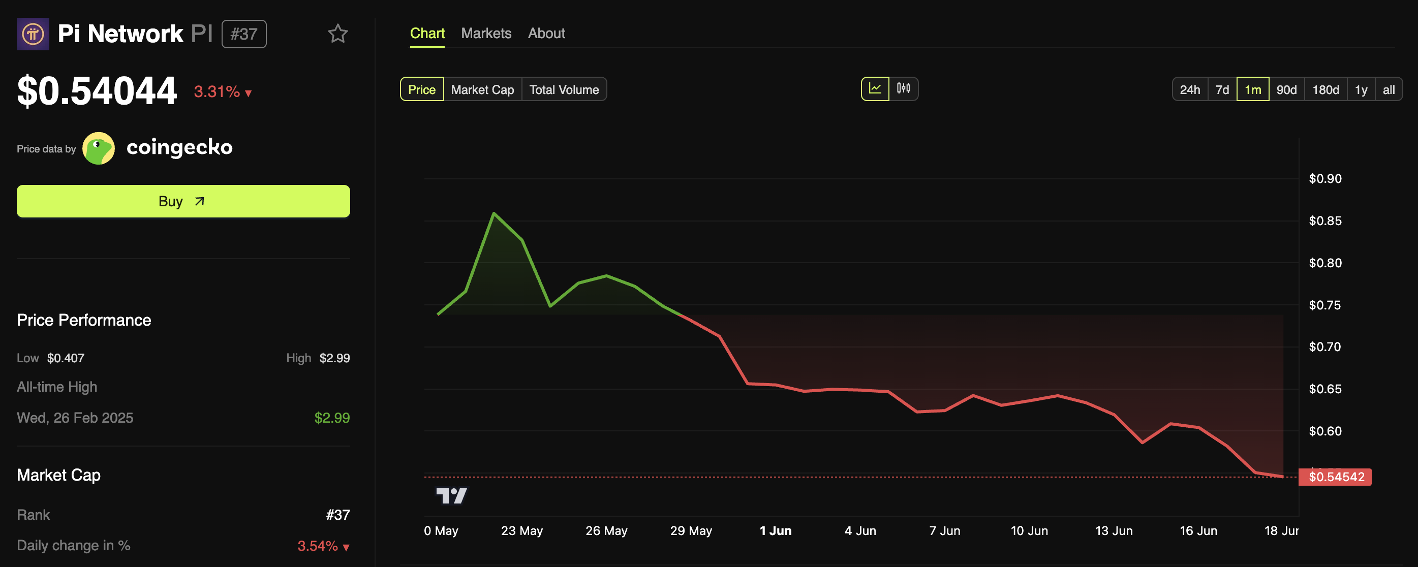 Yozish vaqtida PI narxi $0.54 edi, bu so’nggi kunda 3.3% ga pasaydi. Token tarixiy minimumga yetishdan 32.8% uzoqda.