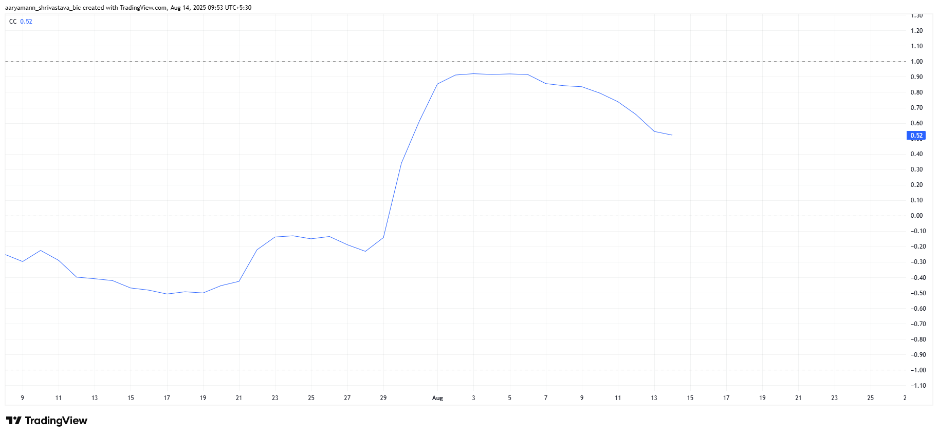 «Pi Coin» tokenining «Bitkoin» bilan bog’liqligi pasayib, hozirda atigi 0.52 darajasida turibdi. Bu bog’liqlikning kamayishi ayniqsa xavotirli, chunki «Bitkoin» yaqinda yangi tarixiy maksimumni qayd etdi.