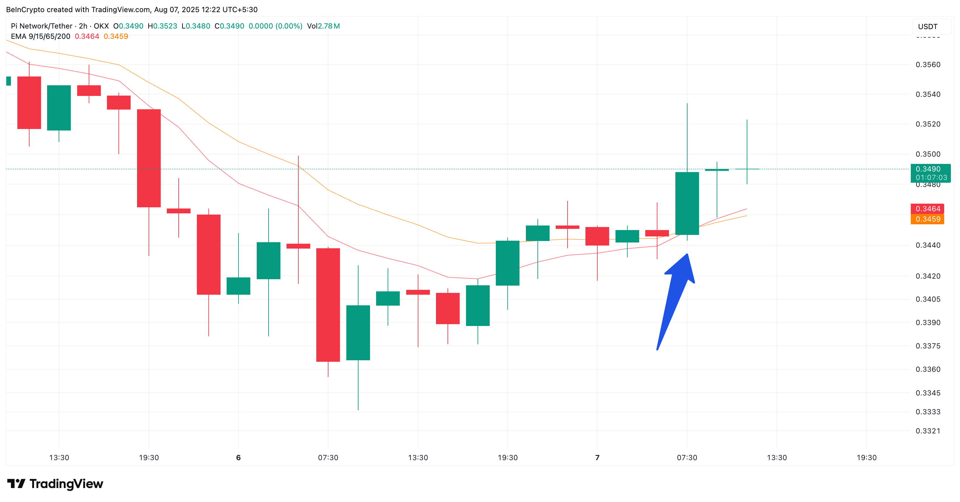 O’sha 2 soatlik jadvalda, PI narxi ham $0.35 yaqinida zich joylashgan ijobiy bayroqning yuqori trend chizig’iga bosim o’tkazmoqda. Ushbu darajadan yuqorida toza sham yopilishi qisqa muddatli yuqoriga harakatni ochishi mumkin, qisqa muddatli maqsadlar $0.36 yaqinida.